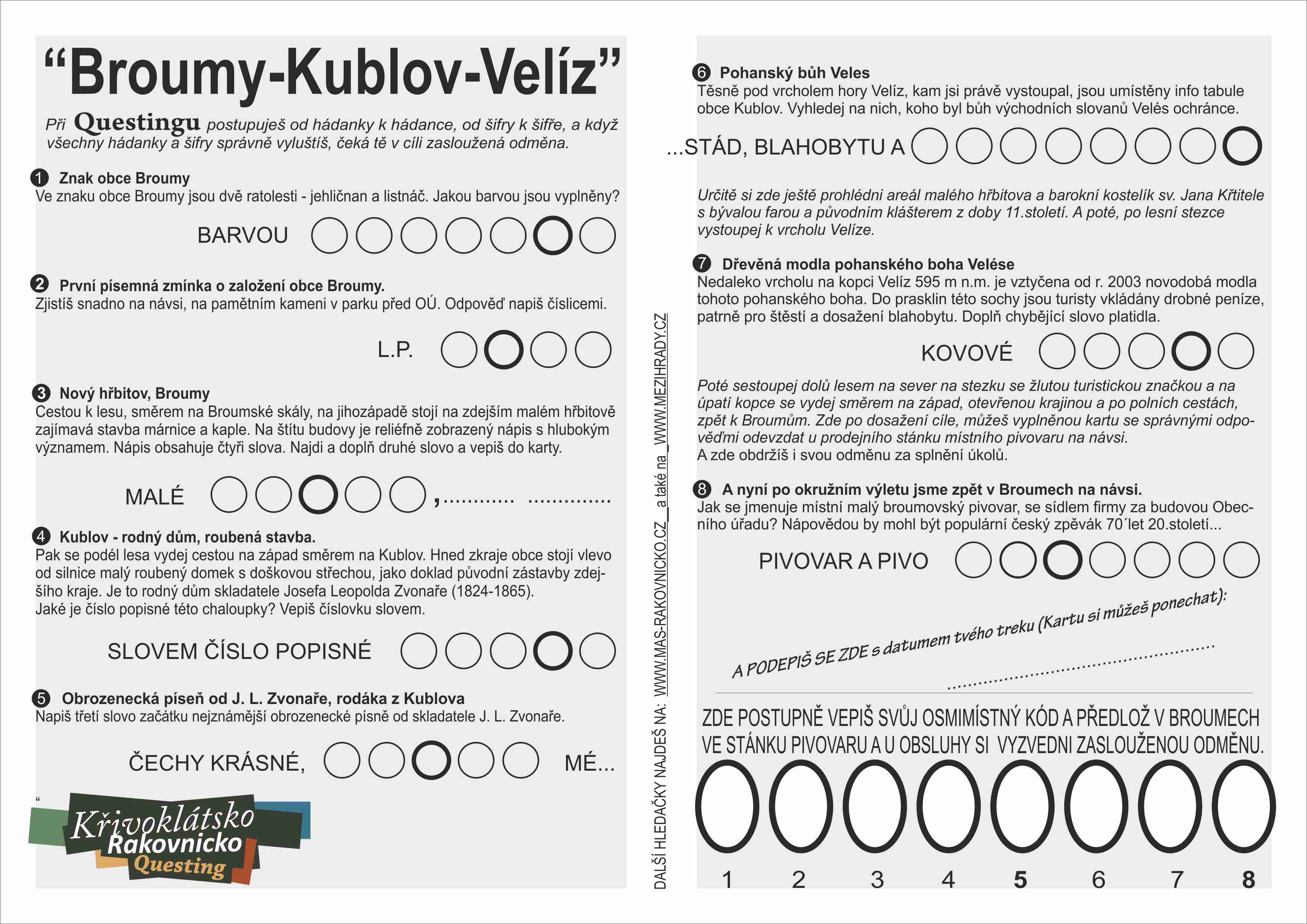 Za jednou z našich questingových tras se vydáme do malebné obce Broumy, která je téměř ze všech stran obklopena překrásnými křivoklátskými lesy. Přímo ve vesnici nás čekají první 3 úkoly, ve kterých se dozvíme zajímavosti o historii a znaku obce, zamíříme i na místní hřbitov, kde si prohlédneme stavby kaple a márnice. Ale nemusíš se vůbec bát! Místní strašidla, jsou moc hodná a mají políčeno jen na zlobivé hledače hádanek, kteří neumí na hřbitově šeptat a ruší je tak ze spánku.